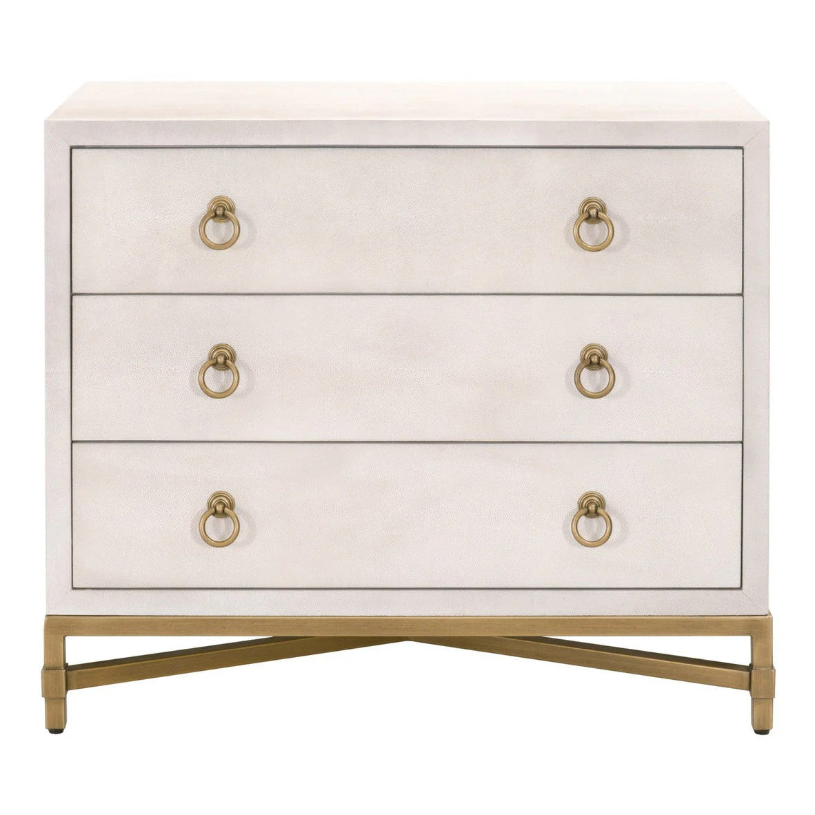 Bề mặt được bọc faux shagreen – chất liệu mô phỏng da cá đuối cao cấp, với những đường vân nổi sang trọng và ánh sắc ngọc trai cuốn hút. Thiết kế khối hộp tối giản kết hợp cùng tay nắm và chân đế kim loại mạ vàng mang lại vẻ đẹp cân đối giữa sự tinh xảo và mạnh mẽ.
